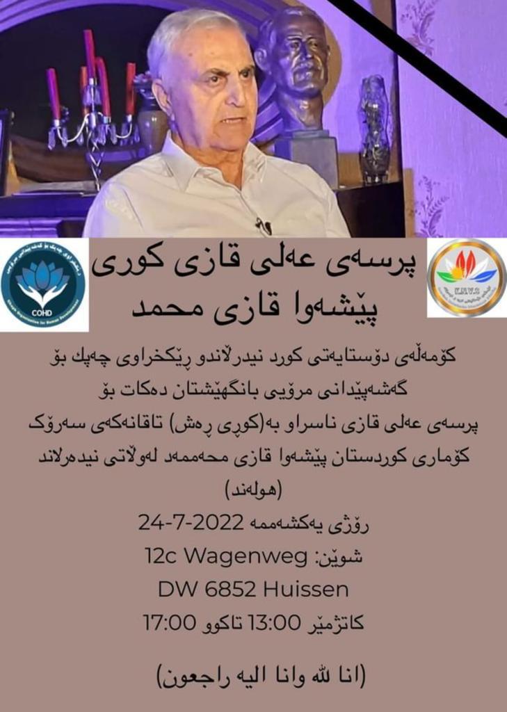 Komeleya Dostaniya Kurd Nederland û Çep a Ji Bo Geşepêdana Mirovî li Holandayê taziyeyek ji bo wefata Elî Qazî kurê tekane serokê Kurdistanê Qazî Mihemed û berpirsê Navenda Rewanda Kurdistanî- Düsseldorf, Almanya li dar xist