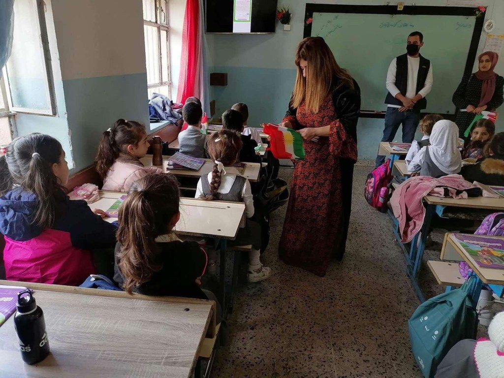 Hêjayî gotinê ye ku li ser navê Navenda Rewanda Kurdistanê û Dezgeha Navnetewî ya Pêşmerge ala pîroz a Kurdistanê li mamoste û xwendekarên dibistanê hate belavkirin .