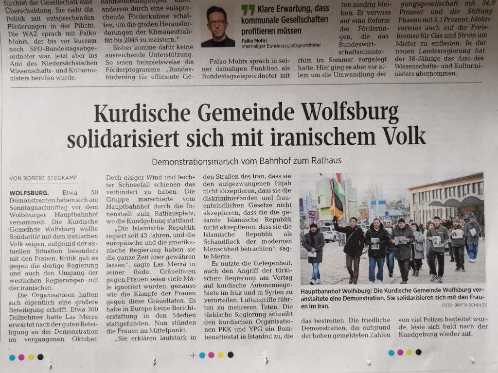 Navenda Rewanda Kurdistanê-Wolfsburg bi amadebûna hejmareke giring a Kurdên her çar parçeyên Kurdistanê meşek ji bo piştgiriya xwepêşandêrên ji Kurdên Rojhilat û Îranê li dar xist û tê de gotara organîzator, partî û çalakvanan di rojnameya bajêr de weke nûçeya giring hate xwendin û weşandin